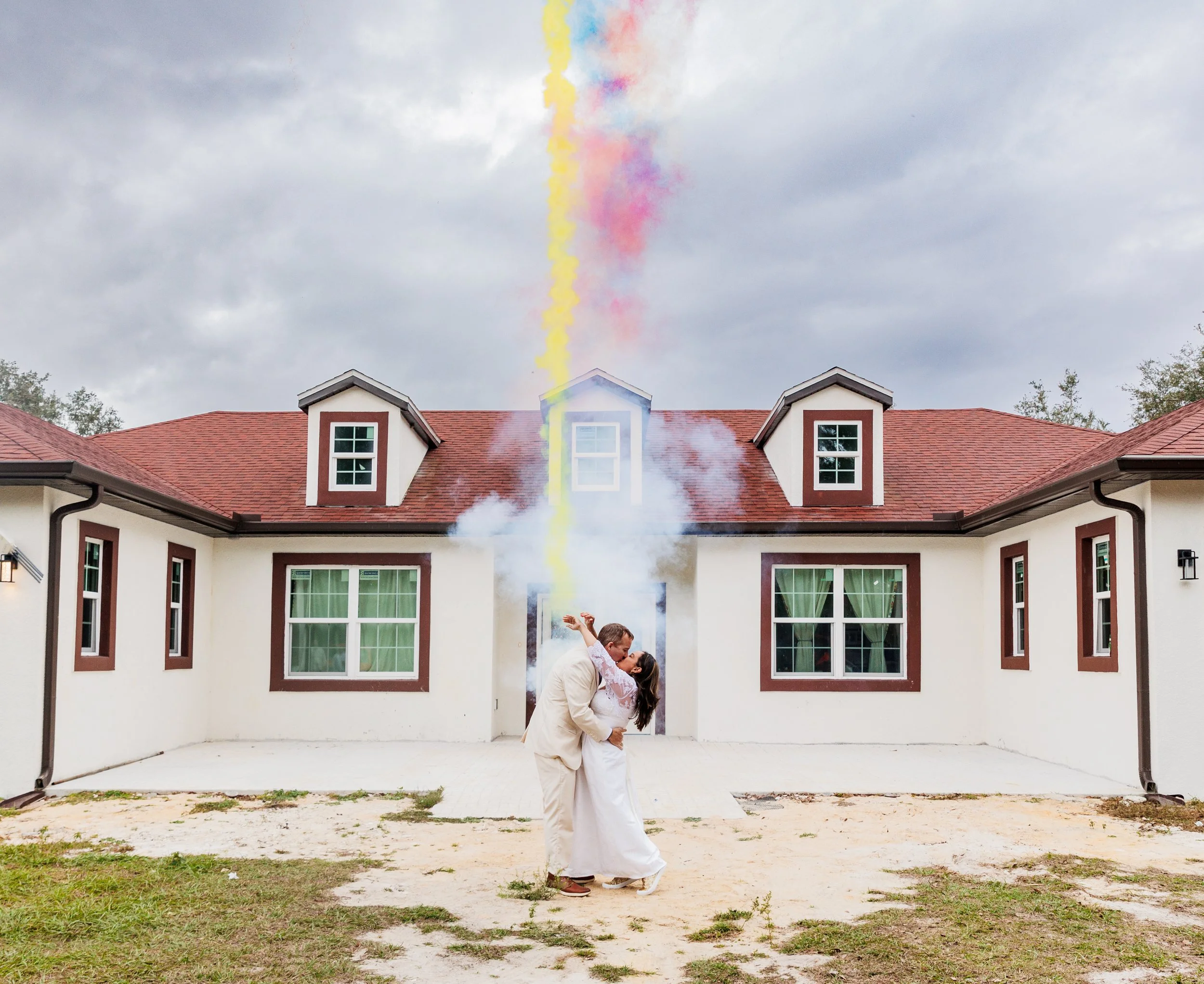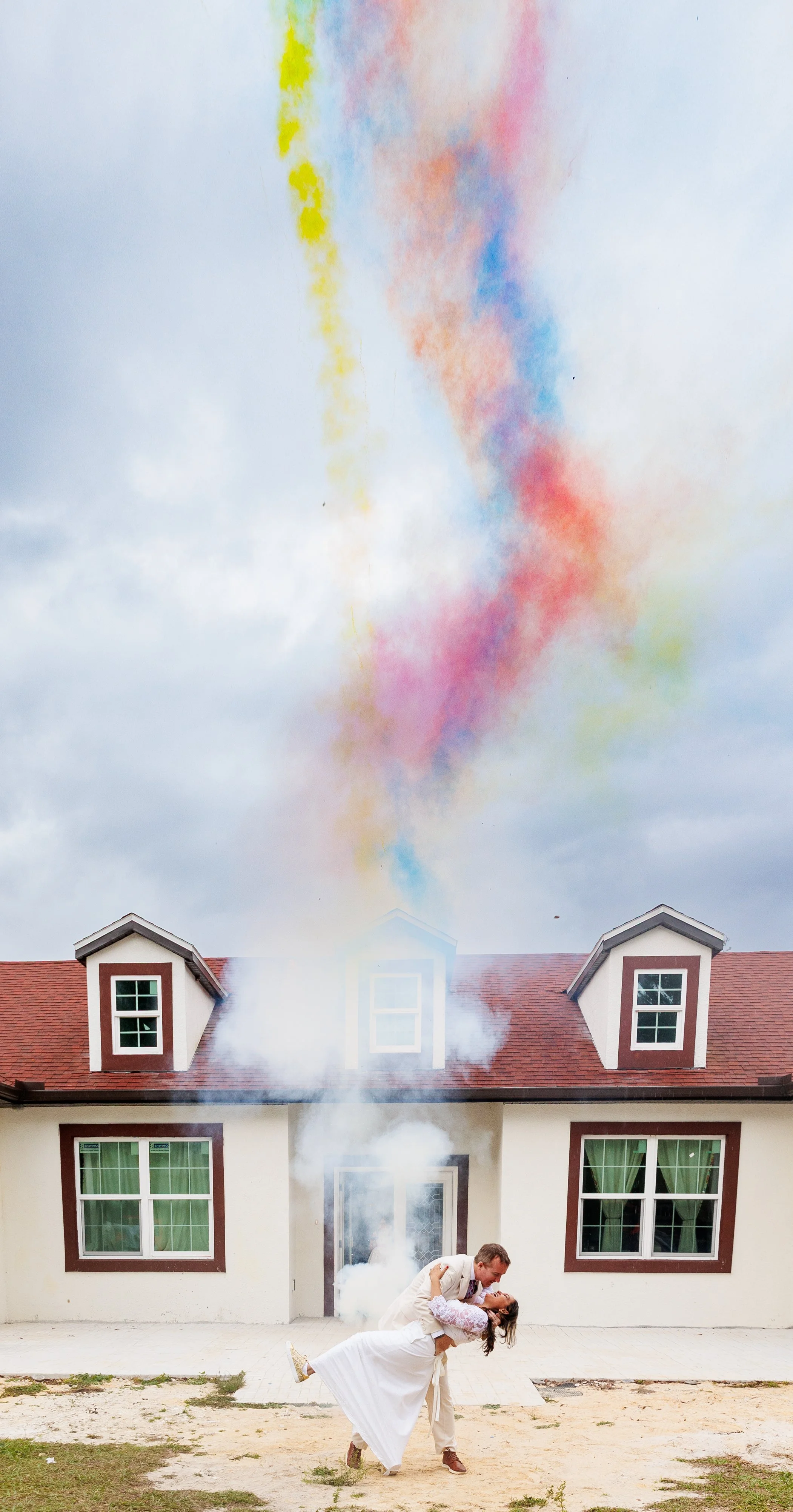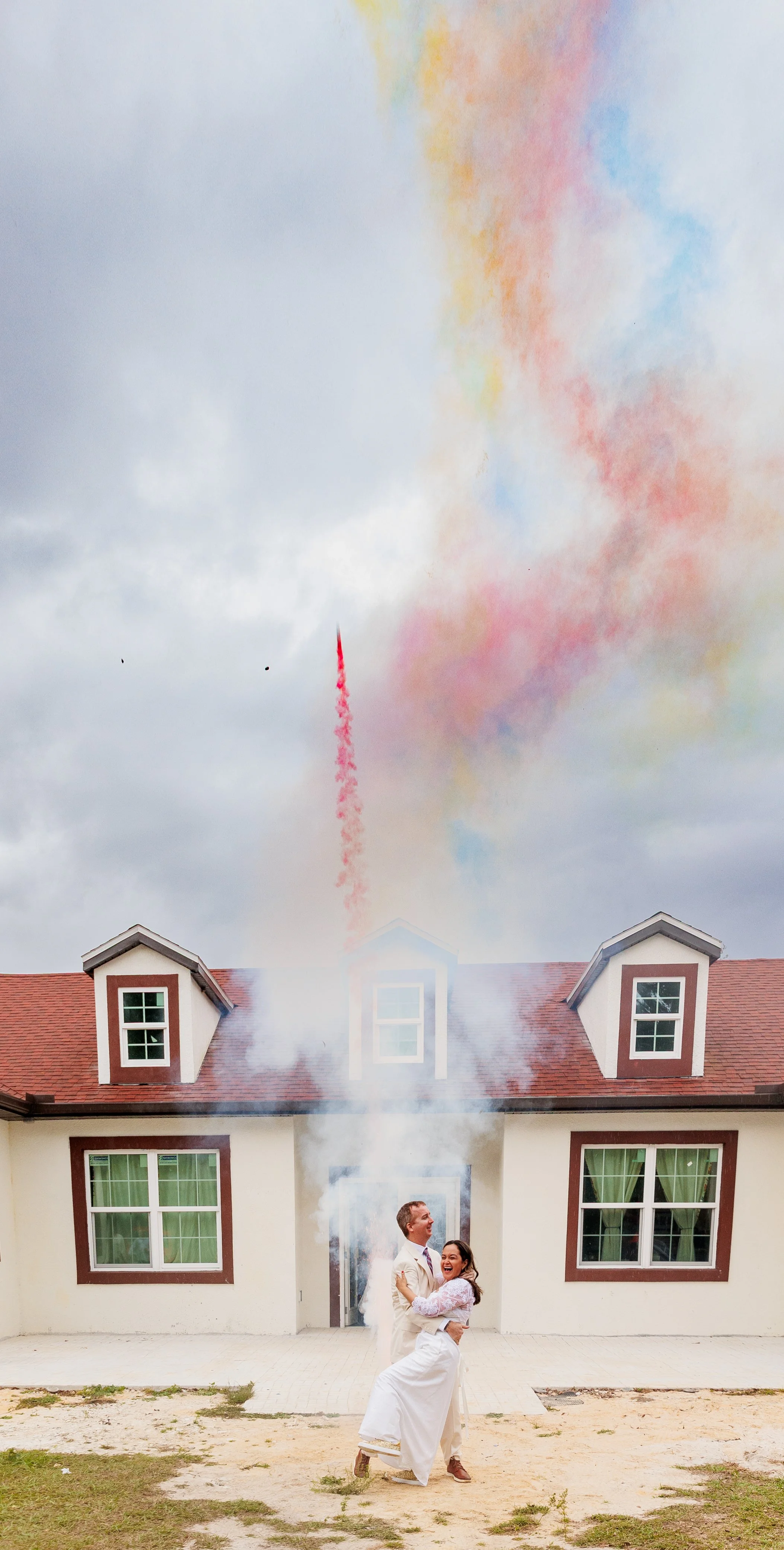 She had seen a video of a wedding ceremony where the moment the couple had their kiss, bright jets of colored smoke exploded in the background. She wanted to duplicate this for a photo.