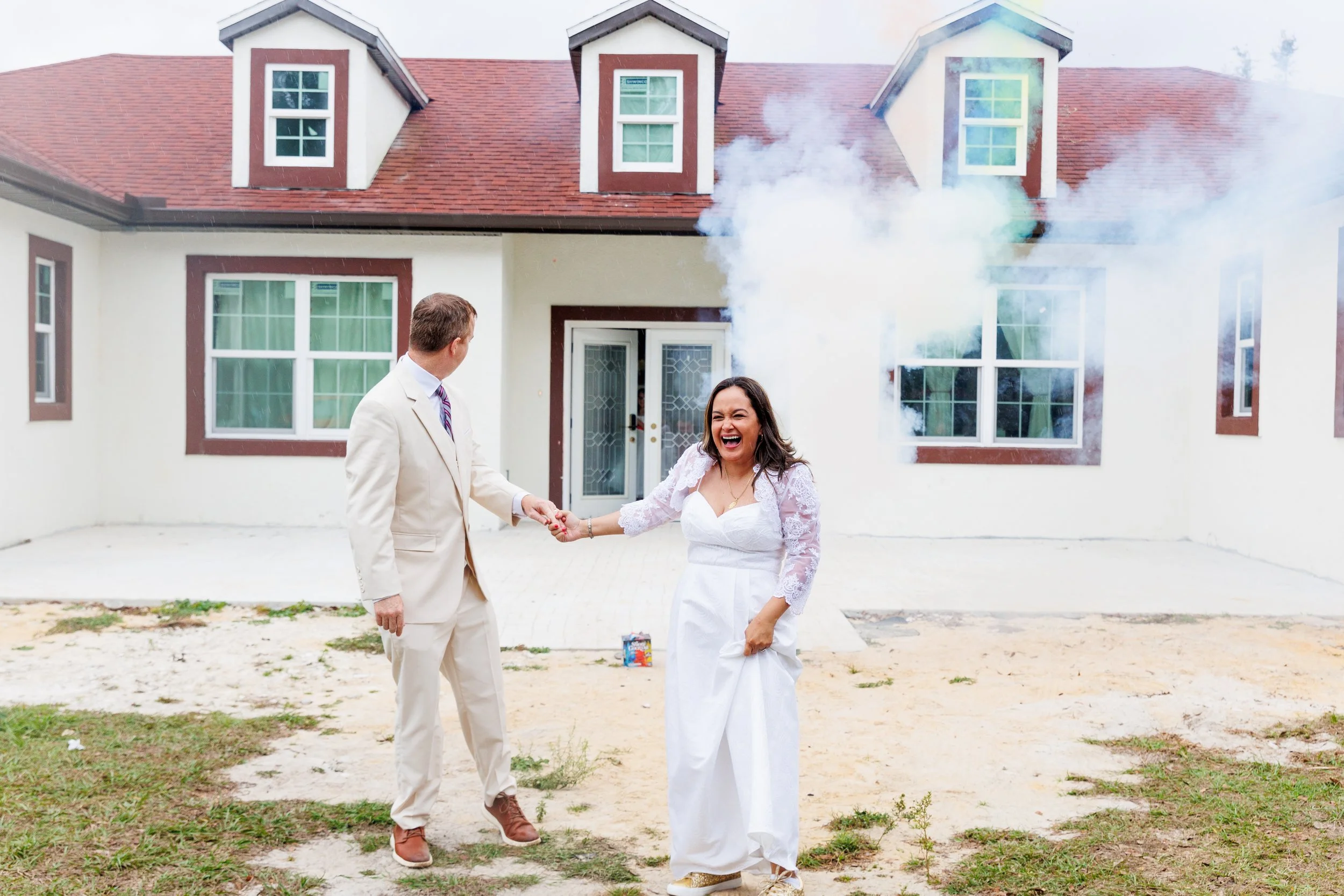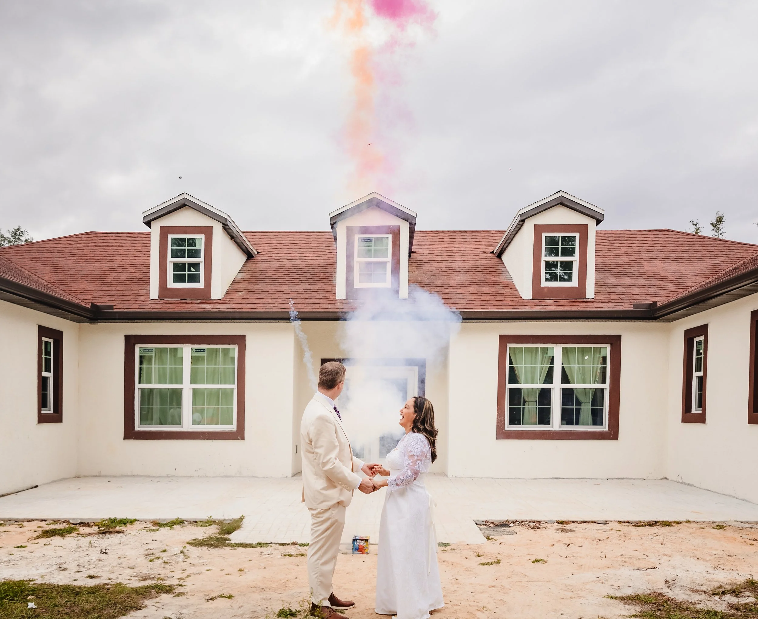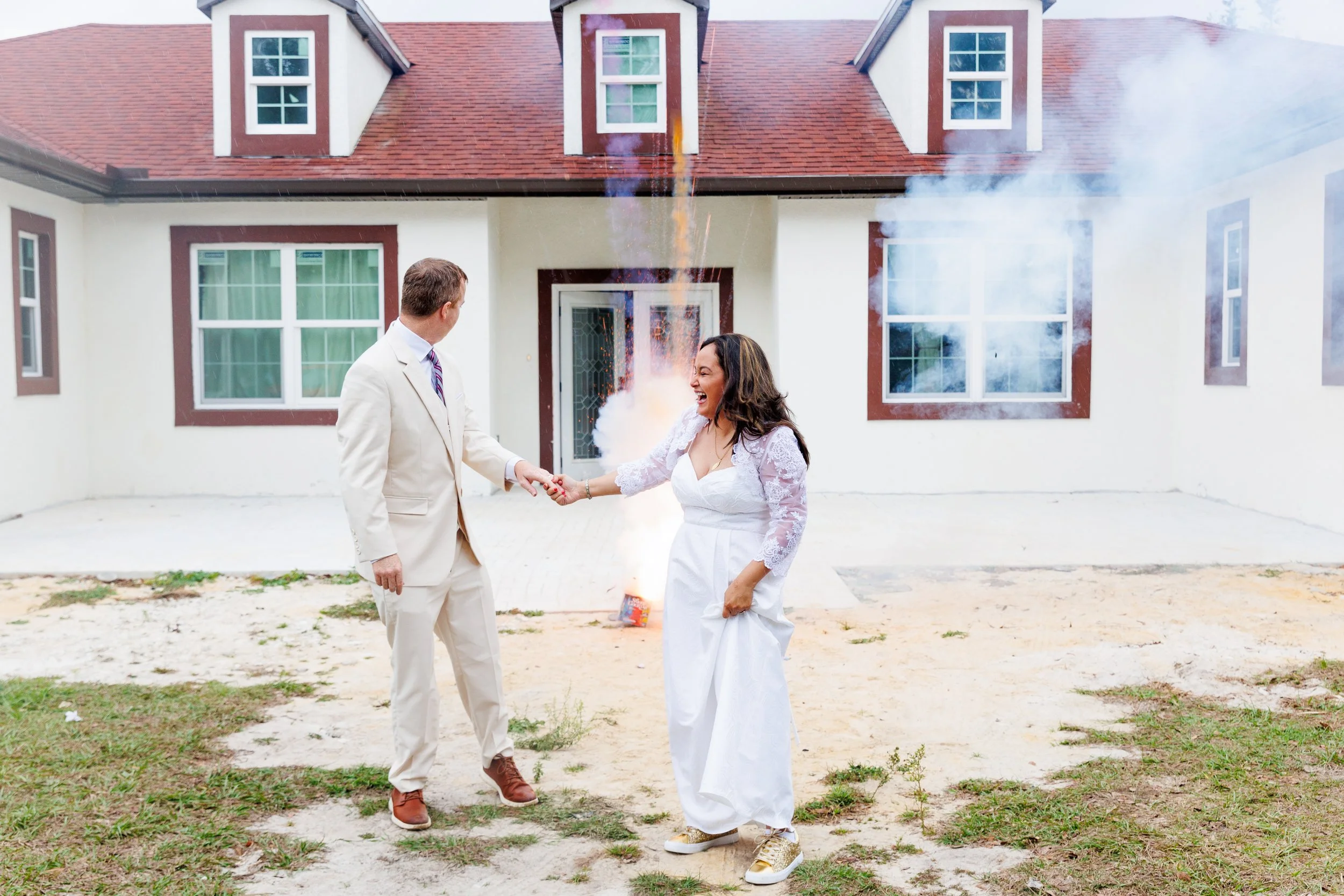 She had seen a video of a wedding ceremony where the moment the couple had their kiss, bright jets of colored smoke exploded in the background. She wanted to duplicate this for a photo.