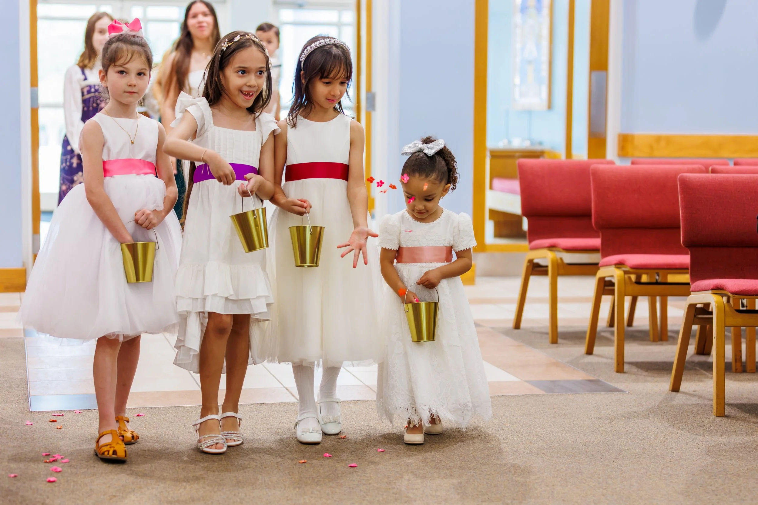 Four flower girls wearing white dresses walk down the aisle throwing flower petals.