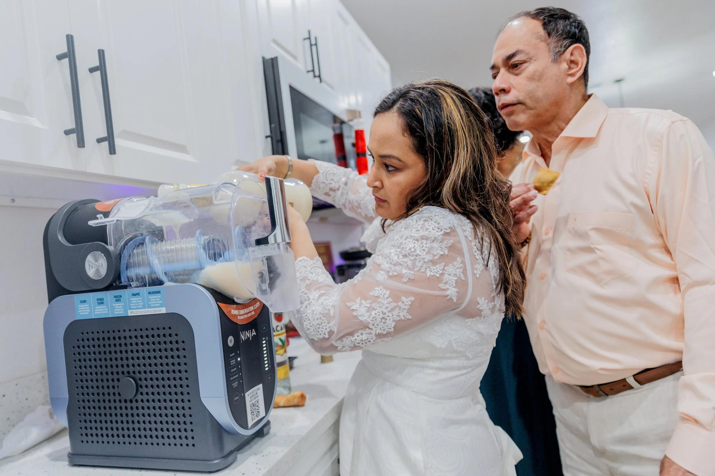 Jennifer pours a drink mix into a margarita machine while her father stands behind her checking out her work.