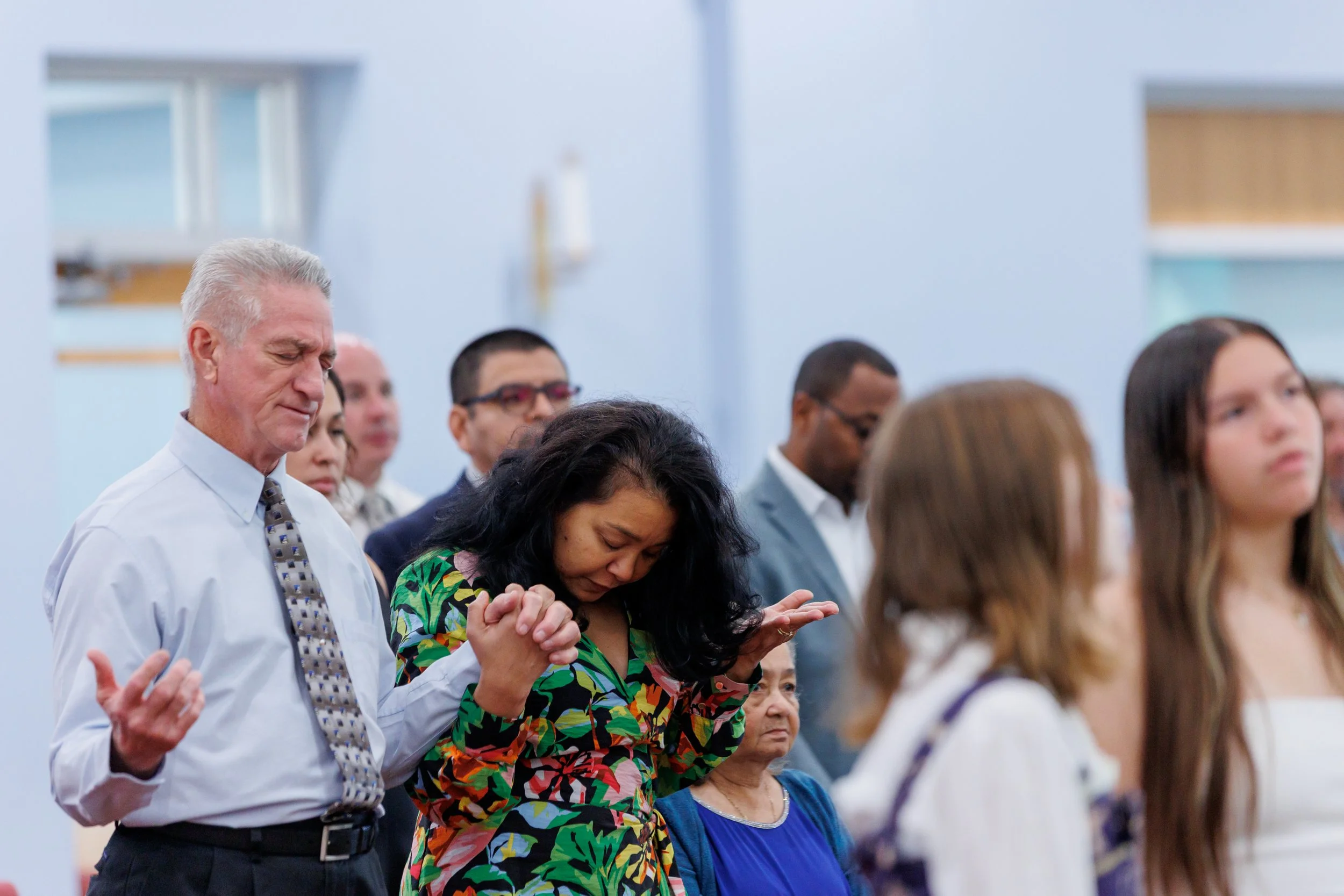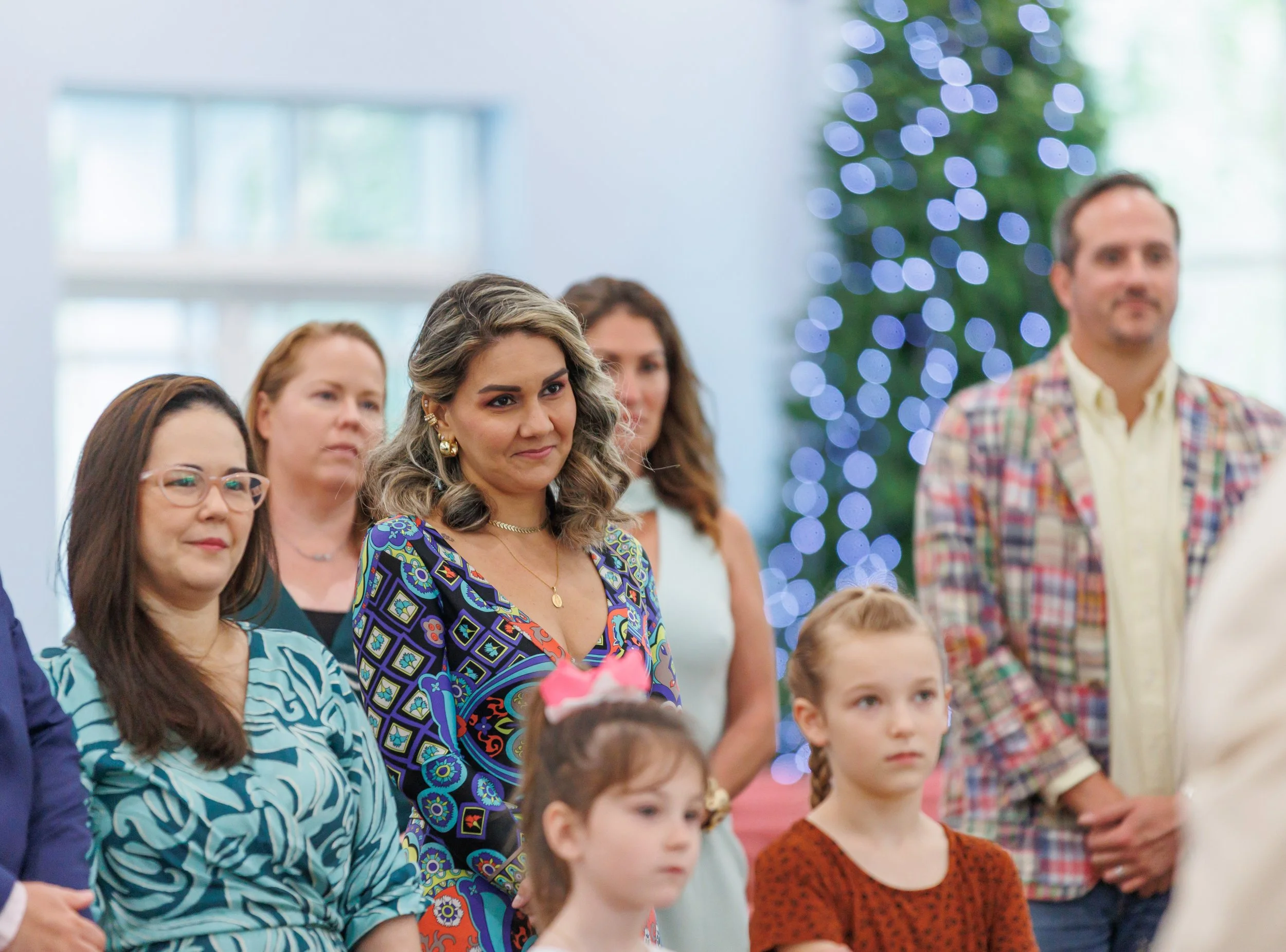 Family members are gathered in the church sanctuary watching the ceremony with smiles on their faces.