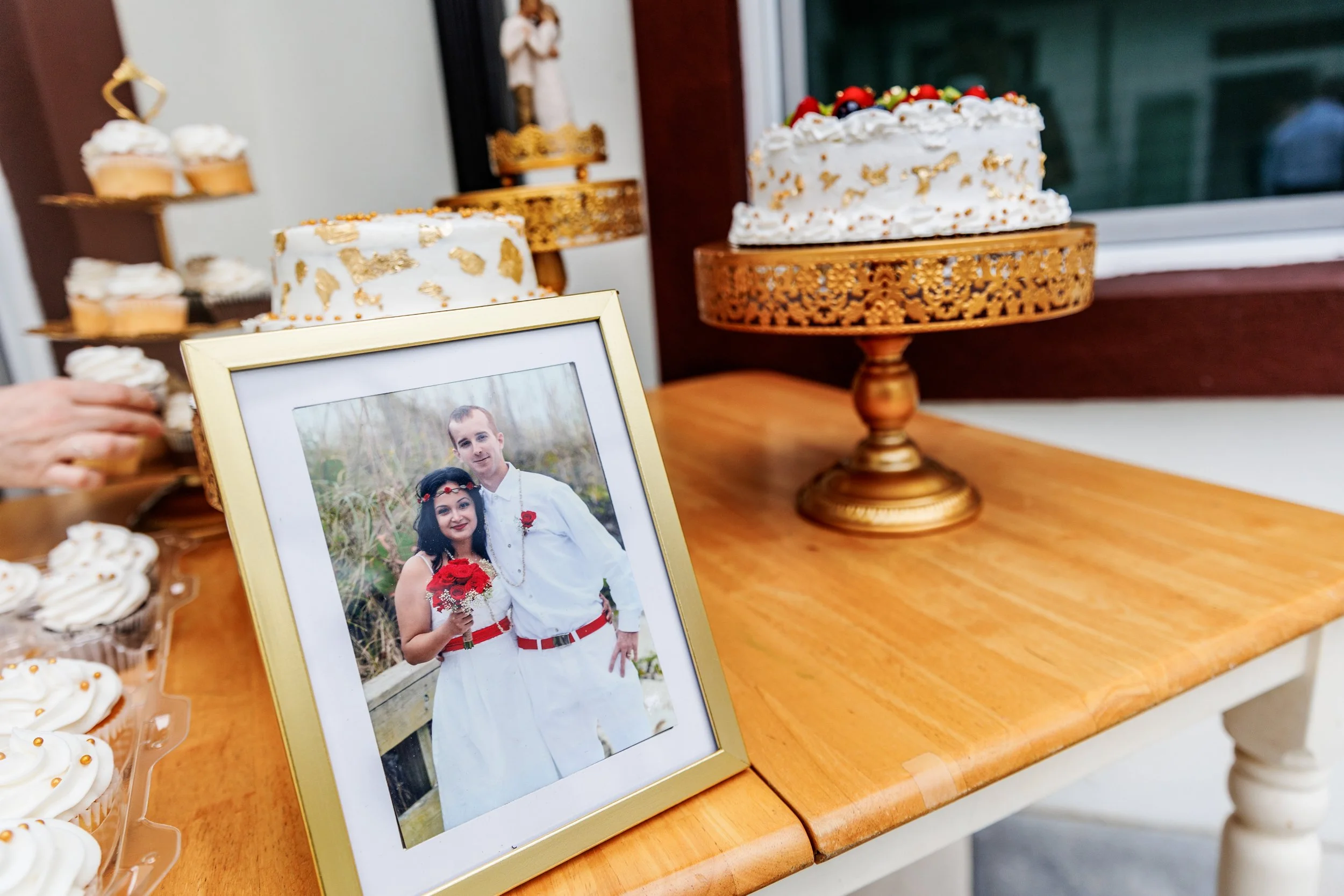a photo of Jen and Charlie when they got married 11 years ago, with a Dulche Leche cake in the background